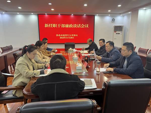 为进一步加强对新任干部的管理和教育,切实增强党纪意识,筑牢廉洁自律防线,11月20日,市退役军人事务局召开新任职干部集体廉政谈话会议。