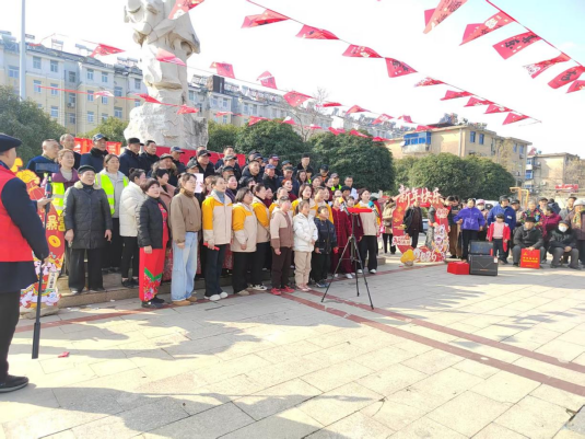 在活动表演区域,志愿者们主动上台助力舞蹈、合唱等文艺节目,保证表演热闹而顺利结束。活动尾声,全体志愿者、工作人员和现场群众齐唱《没有共产党就没有新中国》,抒发爱党爱国情怀。