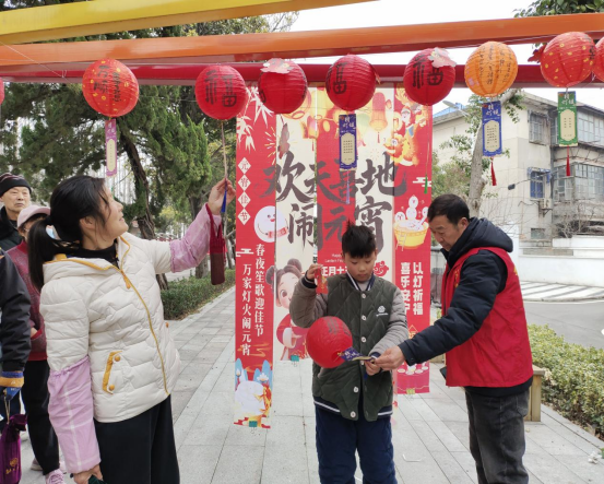 活动现场张灯结彩,年味浓郁,退役军人志愿者们身着统一志愿服装,分工协作、各司其职,共同做好活动场地布置、灯笼及灯谜彩条悬挂等工作,将国防知识、成语和生活常识融入到趣味谜题中,让居民在欢乐中感受拥军爱国氛围。志愿者们细心搀扶老人、照看孩童,引导群众有序参与猜灯谜、做花灯等民俗活动,保障现场秩序安全顺畅,主动为行动不便的困难老人送上一杯热水。