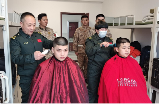 “小推车”拥军服务队还在训练基地设立了服务保障点,分批次进行义务理发。理发师严格按照部队条令中的军容风纪检查标准为“准新兵”整理修剪头发,活动现场秩序井然、温情涌动,焕然一新的精神面貌让他们更显军人的英姿飒爽。