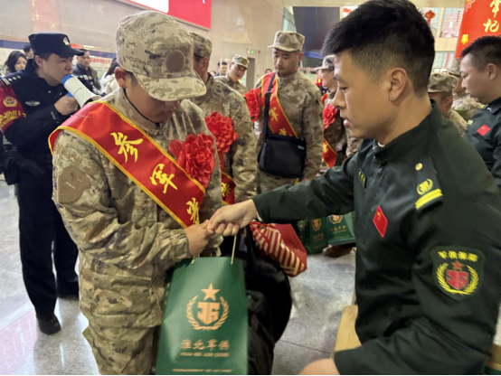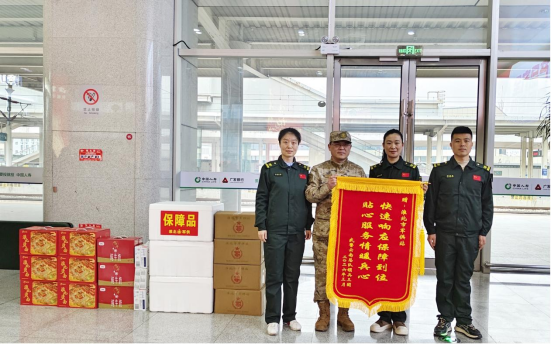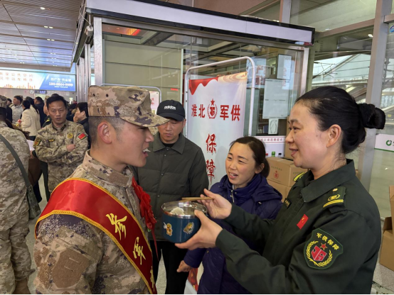 新兵启运当天,淮北军供站“小推车”拥军服务队在火车站设立军供保障点,配备纸巾、军供矿泉水及应急药品等物资,为即将启程的新兵及其家属提供全面的保障服务。同时,服务队还精心布置了多块内容丰富的拥军宣传展架,在车站内外营造出浓厚的尊崇军人、关爱军属的社会氛围,让入伍新兵感受到家乡的温暖与支持,带着荣耀与祝福踏上新征程。